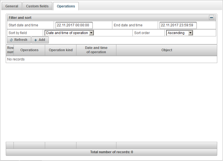 Chun breathnú ar na hoibríochtaí, líon isteach an “Dáta tosaithe agus an t-am”, “Dáta deiridh agus am” agus cliceáil ar an gcnaipe “Athnuachan”.