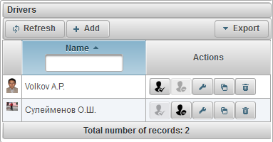 Chun liosta na dtiománaithe a onnmhairiú go Excel nó PDF, cliceáil ar an gcnaipe leis an roghchlár anuas "Export" i bpainéal na dtiománaithe.