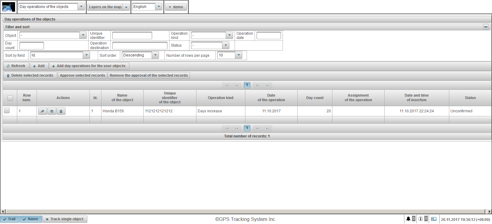 De réir réamhshocraithe, déantar an tábla a shórtáil de réir an réimse "Id." in ord íslitheach. Chun réimse áirithe a shórtáil, sa réimse "Sórtáil de réir páirce", roghnaigh an réimse is mian leat a shórtáil, sa réimse "ordú sórtála", roghnaigh an t-ordú sórtála agus cliceáil ar an gcnaipe "Athnuachan". Is féidir leat scagadh a dhéanamh ar na réimsí “Cuspóir”, “Aitheantóir uathúil”, “Oibríocht chineál”, “Dáta oibríochta”, “Láimhthréimhse”, “Ceann scríbe Oibríochta” agus “Stádas”. Le scagadh, cuir isteach na luachanna do na réimsí seo agus cliceáil ar an gcnaipe "Athnuachan". Is féidir leat líon na línte in aghaidh an leathanaigh a choigeartú freisin sa réimse "Líon na sraitheanna in aghaidh an leathanaigh".