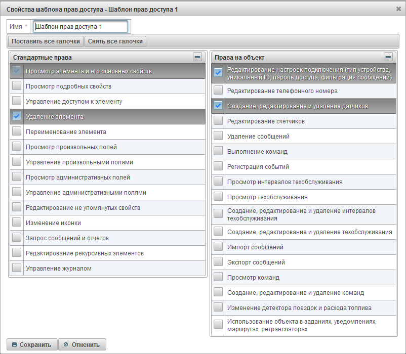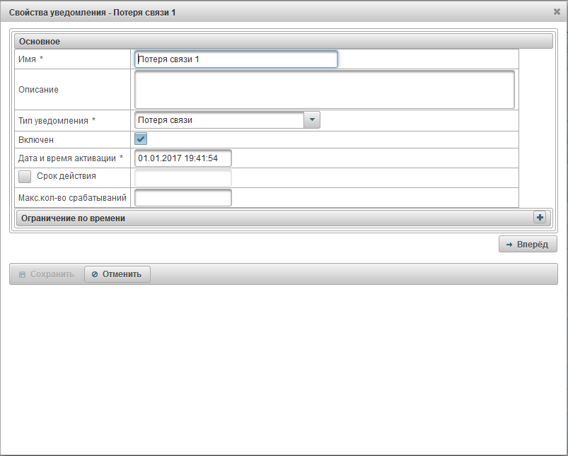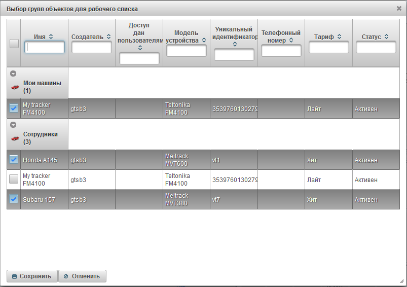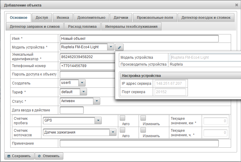Откроется диалог создания нового объекта. В поле "Имя" введите имя объекта, в поле "Модель устройства" выберите модель устройства из списка, в поле "Уникальный идентификатор" введите уникальный идентификатор (IMEI или серийный номер) объекта, в поле "Телефонный номер" введите телефонный номер сим карты, вставленную в устройство. После выбора модели устройства появится справа кнопка