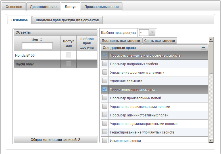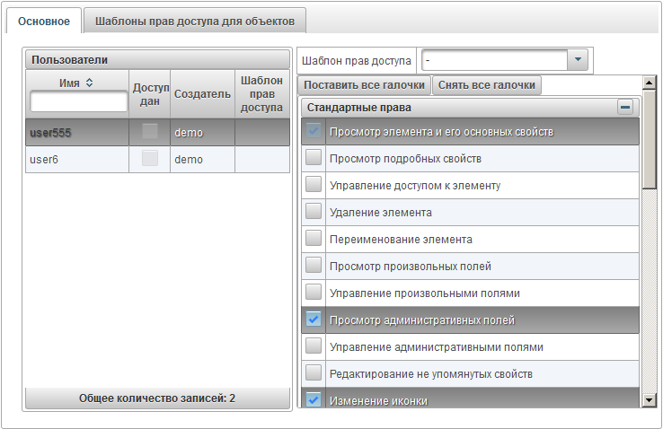 Список доступных панелей зависит от прав пользователя и выбранного интерфейса (интерфейс пользователя или интерфейс менеджера).