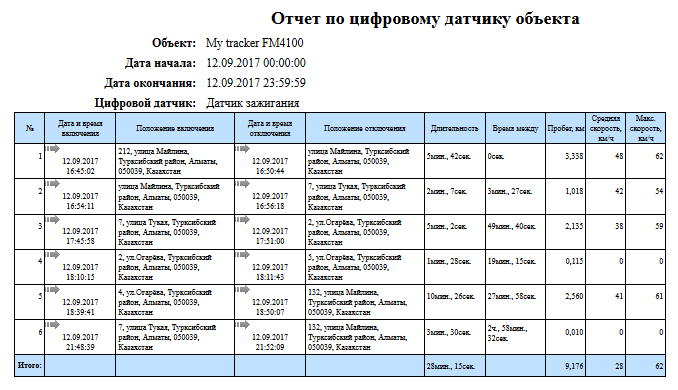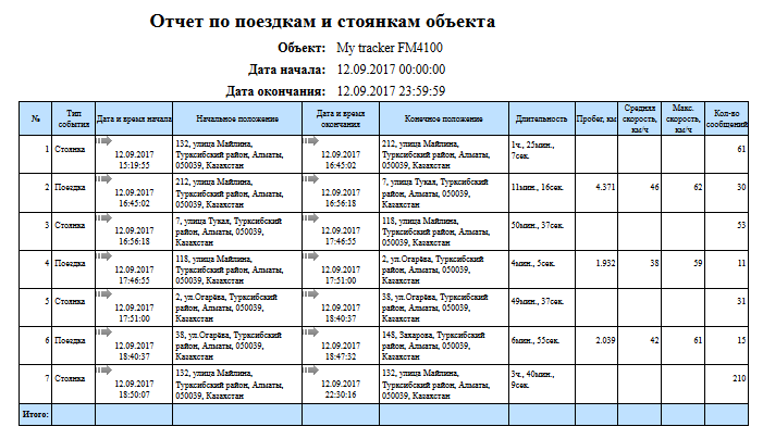 {"count":2,"motohours":[{"finish_motohours_in_sec":590,"message_id_list":[697737,697738,697739,697740,697741,697742,697743,697744,697745,697746,697747,697748,697749,697750,697751,697752,697753,697754,697755],"message_cnt":19,"time_from_prev_end_to_cur_beg":0,"duration_in_sec":590,"start_message_id":697737,"finish_message_lon":76.8967104,"motohours_in_sec_str":"9min., 50s.","start_message_location":"289/1, улица Розыбакиева, Баганашыл, Almaty, Бостандыкский район, Almaty, 050023, Kazakhstan","start_message_coordinates_str":"43.194832, 76.893901 (5)","start_message_lon":76.8939008,"start_message_lat":43.194832,"time_from_prev_end_to_cur_beg_str":"","finish_motohours_in_sec_str":"9min., 50s.","finish_message_dt":"01.06.2016T10:44:56","movement_productivity":89.83,"mileage":3397,"start_motohours_in_sec":0,"start_motohours_in_sec_str":"","duration_short_str":"9min., 50s.","motohours_in_sec":590,"avg_speed_in_kph":34,"finish_message_coordinates_str":"43.214048, 76.89671 (8)","finish_message_location":"31, Baikadamov St, Баганашыл, Almaty, Бостандыкский район, Almaty, 050060, Kazakhstan","obj_id":10524,"finish_message_lat":43.214048,"movement_time_in_sec":530,"finish_message_id":697755,"movement_time_in_sec_str":"8min., 50s.","max_speed_in_kph":50,"idling_time_in_sec":60,"start_message_dt":"01.06.2016T10:35:06","idling_time_in_sec_str":"1min."},{"finish_motohours_in_sec":820,"message_id_list":[697929,697930,697931,697932,697933,697934,697935,697936,697937,697938],"message_cnt":10,"time_from_prev_end_to_cur_beg":1272,"duration_in_sec":230,"start_message_id":697929,"finish_message_lon":76.894336,"motohours_in_sec_str":"3min., 50s.","start_message_location":"217, Gagarin Ave, Баганашыл, Almaty, Бостандыкский район, Almaty, 050060, Kazakhstan","start_message_coordinates_str":"43.213459, 76.897894 (8)","start_message_lon":76.8978944,"start_message_lat":43.2134592,"time_from_prev_end_to_cur_beg_str":"21min., 12s.","finish_motohours_in_sec_str":"13min., 40s.","finish_message_dt":"01.06.2016T11:09:58","movement_productivity":100,"mileage":1834,"start_motohours_in_sec":590,"start_motohours_in_sec_str":"9min., 50s.","duration_short_str":"3min., 50s.","motohours_in_sec":230,"avg_speed_in_kph":36,"finish_message_coordinates_str":"43.200099, 76.894336 (8)","finish_message_location":"Кожабекова, Kozhabekov St, Баганашыл, Almaty, Бостандыкский район, Almaty, 050023, Kazakhstan","obj_id":10524,"finish_message_lat":43.2000992,"movement_time_in_sec":230,"finish_message_id":697938,"movement_time_in_sec_str":"3min., 50s.","max_speed_in_kph":43,"idling_time_in_sec":0,"start_message_dt":"01.06.2016T11:06:08","idling_time_in_sec_str":""}]}
