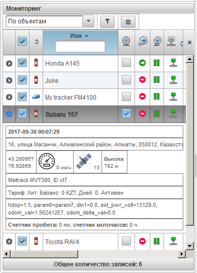 Расширенная информация об объекте отображается при нажатии на иконку в таблице рабочего списка объектов панели мониторинга (в режиме мониторинга по объектам). Содержимое расширенной информации об объекте зависит от настроек пользователя.