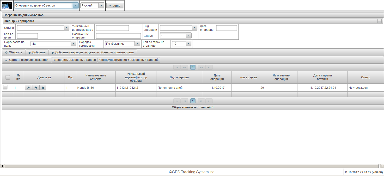 По умолчанию таблица отсортирована по полю "Ид." в порядке убывания. Для сортировки по конкретному полю, необходимо в поле "Сортировка по полю" выбрать поле, по которому нужно отсортировать, в поле "Порядок сортировки" выбрать порядок сортировки и нажать на кнопку "Обновить". Также предусмотрена возможность фильтрации по полям "Объект", "Уникальный идентификатор", "Вид операции", "Дата операции", "Кол-во дней", "Назначение операции" и "Статус". Для фильтрации введите значения по этим полям и нажмите кнопку "Обновить". Также можно настроить количество строк на странице в поле "Кол-во строк на странице".