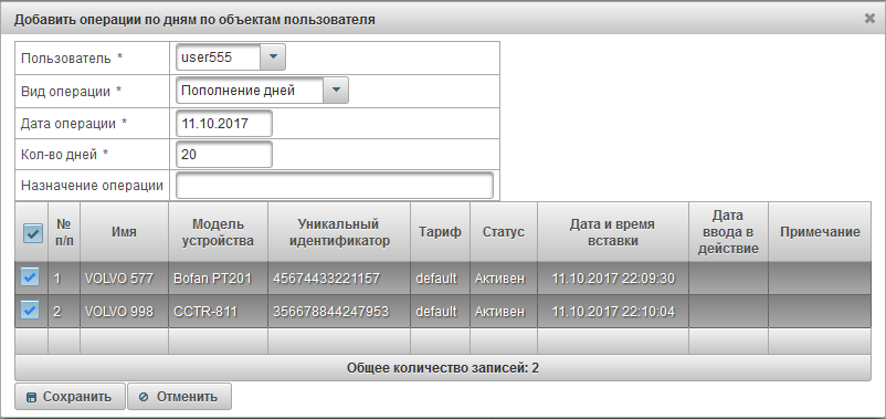 Панель "Операции по дням объектов" доступна только для дилеров и позволяет добавлять операции по дням объектов, например когда пользователь хочет оплатить за 20 дней пользования объектом или когда вы хотите вручную снять дни у объекта.