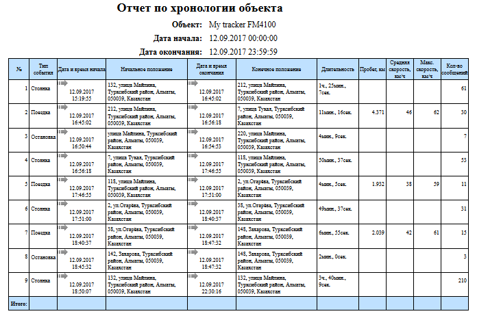 Системный отчет "Отчет по хронологии объекта" позволяет узнать где и когда объект изменял состояние. Параметры определения поездок и стоянок задаются на вкладке "Детектор поездок и стоянок" свойств объекта. Отчет состоит из следующих параметров: