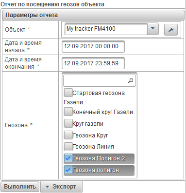 Системный отчет "Отчет по посещению геозон объекта" позволяет узнать где и когда объект посещал выбранные геозоны. Отчет состоит из следующих параметров: