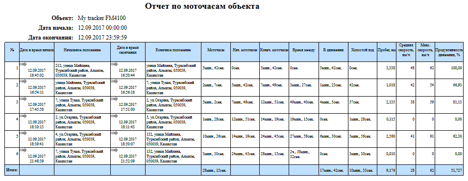 Системный отчет "Отчет по моточасам объекта" позволяет узнать как долго объект находился с включенным двигателем, сколько времени был в движении и состоит из следующих параметров: