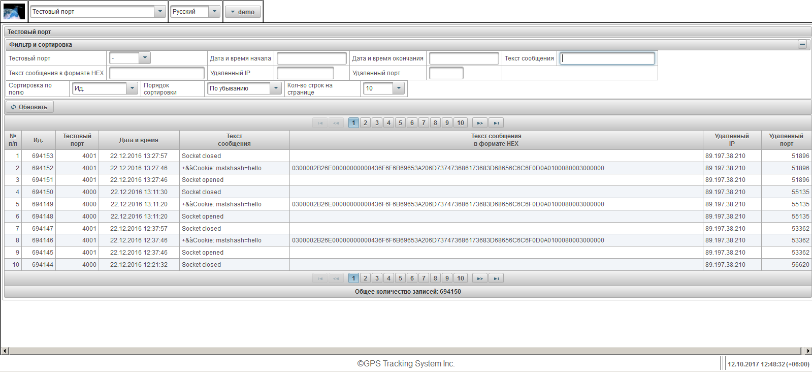 По умолчанию таблица отсортирована по полю "Ид." в порядке убывания. Для сортировки по конкретному полю, необходимо в поле "Сортировка по полю" выбрать поле, по которому нужно отсортировать, в поле "Порядок сортировки" выбрать порядок сортировки и нажать на кнопку "Обновить". Также предусмотрена возможность фильтрации по полям "Тестовый порт", "Дата и время начала", "Дата и время окончания", "Текст сообщения", "Текст сообщения в формате HEX", "Удаленный IP" и "Удаленный порт". Для фильтрации введите значения по этим полям и нажмите кнопку "Обновить". Также можно настроить количество строк на странице в поле "Кол-во строк на странице".