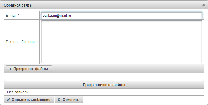 Откроется диалоговое окно «Обратная связь». По умолчанию в поле "E-mail" будет заполнено e-mail текущего пользователя, ответ от службы поддержки будет отправлен на этот e-mail. В поле "Текст сообщения" введите Ваш текст сообщения. Также можно будет прикрепить файлы, нажав кнопку "Прикрепить файлы".